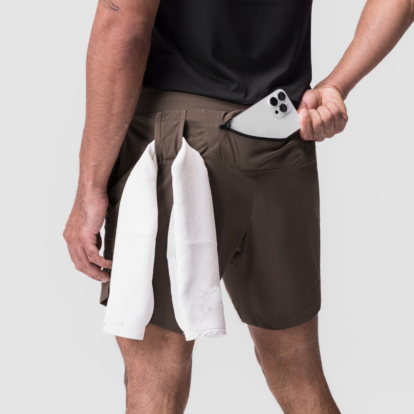 Utility pockets for phone, card or keys and a shirt/towel loop.